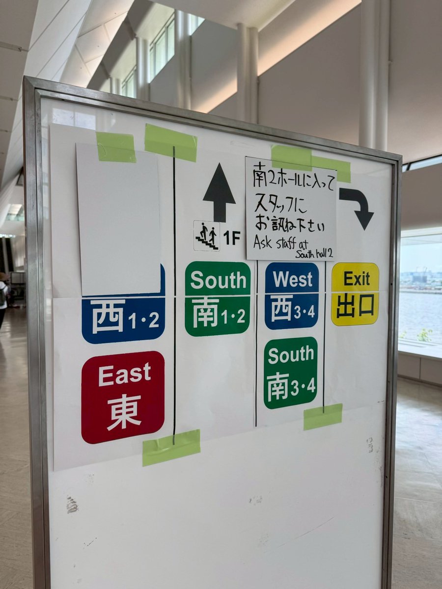 そして、この夏の最大のトラブルとなったのは、エスカレータの故障です。1日目の午前から、南コンコース・西4階間の全てのエスカレータが停止し、いったん復旧したものの再度停止、以後会期終了まで使用できませんでした。それゆえ、当初予定していた導線の予定を大幅に変更し、企業ブースから1階に降りるには、スロープや南展示棟のエスカレータを活用せざるを得なくなりました。やや自画自賛的にはなりますが、万一のエスカレータ停止時の代替案は事前に検討が行われていたこともあり、主導線のトラブルにも関わらず何とか対応することができました。とは言え、参加者の皆さんに多大なご迷惑をおかけいたしましたこと、深くお詫びいたします。また、何よりも皆さんが準備会の指示に従って行動いただき、大きな混乱なく会期を終えることができたことに、深く感謝する次第です。