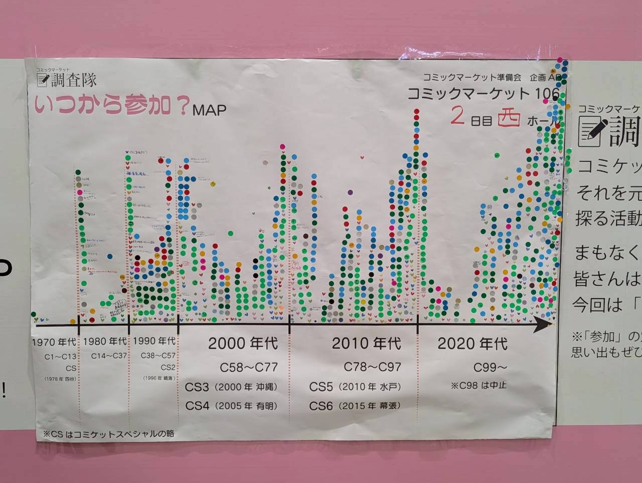 その他、コスプレ関連以外にも各種企画も引き続き行っていますが、「いつからコミケに参加したのか」のアンケートを取ったり、歴代のコミックマーケットカタログの表紙やスタンプラリーのスタンプを一同に集めての展示を行ったりと、50周年にちなんだ企画をいくつか行っています(詳細は『