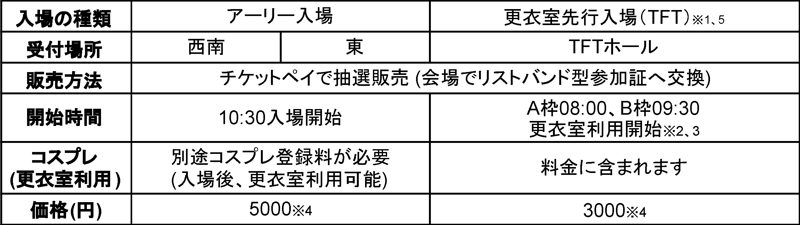 | 種類(参加形態) | 更衣室先行入場チケット(TFT) | |||