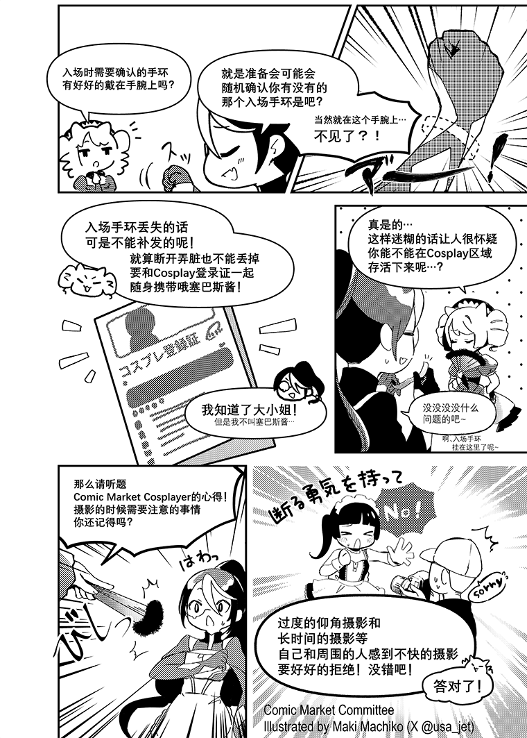 - 所有 Comic Market 参与者(包括 Cosplayer)都必须购买腕带或可兑换腕带的入场券。